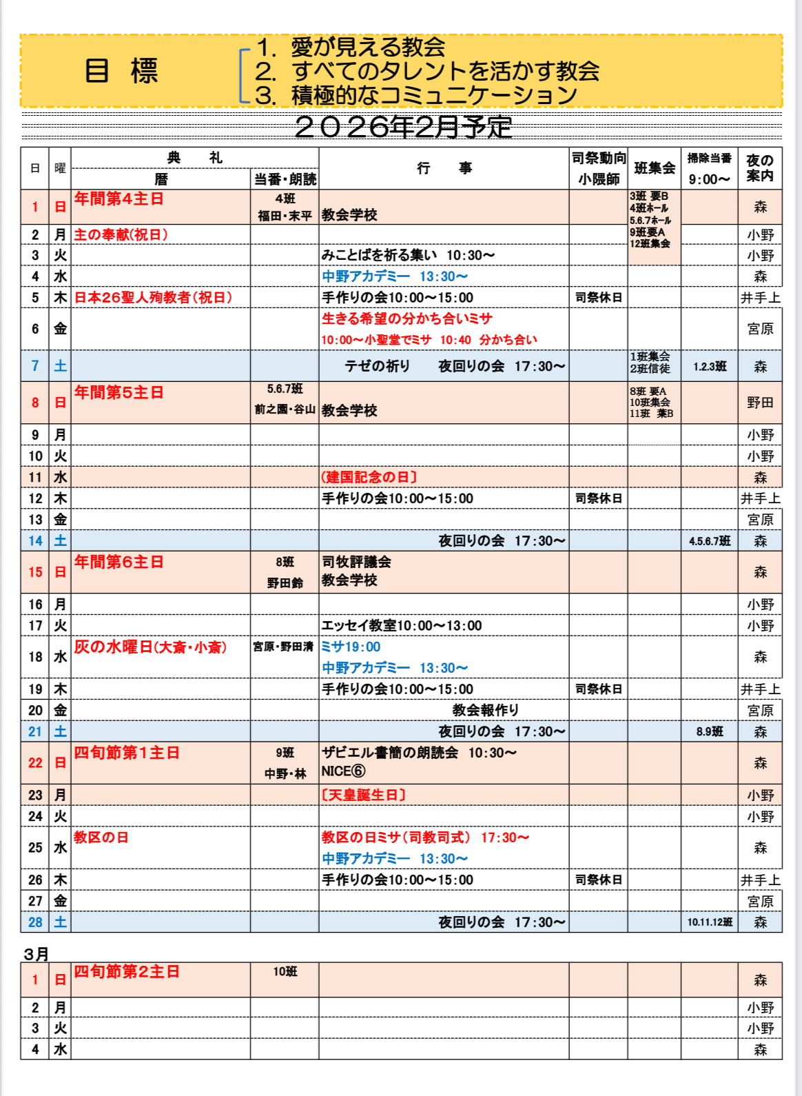 ザビエル教会の2月の予定表です。ご覧ください。